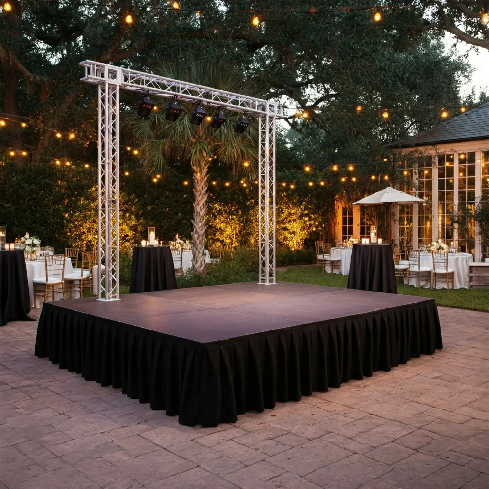 Our skirted stages are the most popular option for weddings, galas, and special events. Featuring black or custom stage skirting, they conceal all hardware for a sleek and elegant look. Available in various heights and sizes, these stages create the perfect centerpiece for dancing, live entertainment, or ceremonies. With professional delivery and setup, The Event Rental Guys make it easy to elevate your event’s appearance.